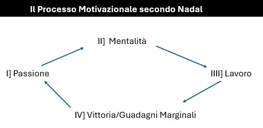 Rafa ci ricorda che la passione, che innesca tutto il processo, Per essere alimentata ha bisogno di un premio motivazionale derivante da un guadagno, da una vittoria, che non può essere qualcosa di lontano e astratto, ma deve essere qualcosa di quotidiano e concreto. Vincere non significa vincere uno Slam, significa sapere cosa devo fare per poter andare a letto questa sera ripensando al giorno appena trascorso come vincente: cosa vuol dire considerare vincenti le prossime ore? E questo che la mentalità deve definire. Ottenere questi guadagni marginali mi permette di crescere in confidenza e di avere quindi un ritorno positivo anche sulla competenza, come vedremo in un prossimo post.